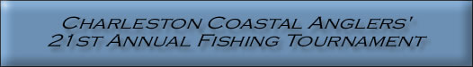 Meeting and Registration James Island Yacht Club 734 Wampler Drive James Island, SC Tuesday - July 13, 2004 6:30 pm to 8:00 pm Door prizes, free beverages, and heavy hors d'oeuveres Entry Fee $30.00 per adult $15.00 per youth (15 and younger) Tournament Day Saturday - July 17, 2004 (fishing from 12:01 am to 5:30 pm) Weigh-in 4:00 to 5:30 pm James Island Yacht Club Awards Ceremony Saturday - July 17, 2004 Following the weigh-in Late Registration Friday - July 16, 2004 Until 6:00 pm at: Toby's Bait & Tackle The Reel John's Barton & Burwell Folly Road Tackle Haddrell's Point |