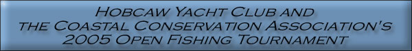 Day Saturday - October 29, 2005 6:00 am to 4:00 pm weigh-in 2:00 pm to 4:00 pm Awards Ceremony following the weigh-in Elgible Species Trout Flounder Sheepshead Awards prizes for each species: 1st Place 2nd Place 3rd Place CCA Award for Largest Aggregate for Youth Angler (Must be CCA member boat) CCA Raffle Drawing at the Captain's Meeting for a 1/2 day Southern Quail Hunt with Capt. Sandy Stuhr |