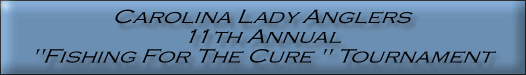 Meeting and Registration Charleston Maritime Center Wednesday - May 28, 2008 6:00 pm Tournament Date Saturday - May 31, 2008 Fishing begins at 12:00 am Weigh-in 4:00 to 6:00 pm Charleston Maritime Center Awards Ceremony following the weigh-in Late Registration Charleston Angler - W. Ashley Haddrells W. Ashley and Mt. Pleasant Contact Information CLA website: www.carolinaladyanglers.org CLA email: info@carolinaladyanglers.org This tournament raises money for Breast Cancer Research |