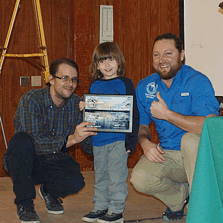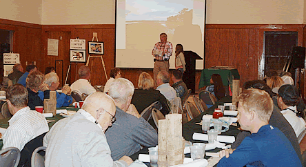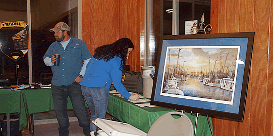 vintage Jim Booth print pictured above was won by Mike Waller in the "card game". Below, Dee Oliver, former Committee Member was our emcee and is being assisted by an angler in drawing the unlucky "card game" cards. |
